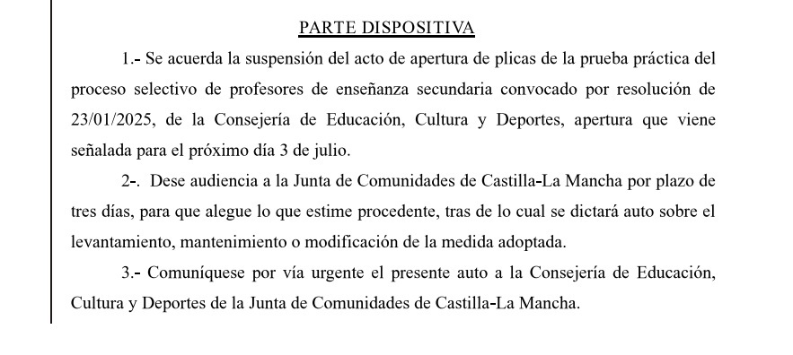[01 -07-2025] AUTO JUDICIAL SUSPENDIENDO APERTURA DE PLICAS ESPECIALIDAD PGA PREVISTO PARA DÍA 3 DE JULIO