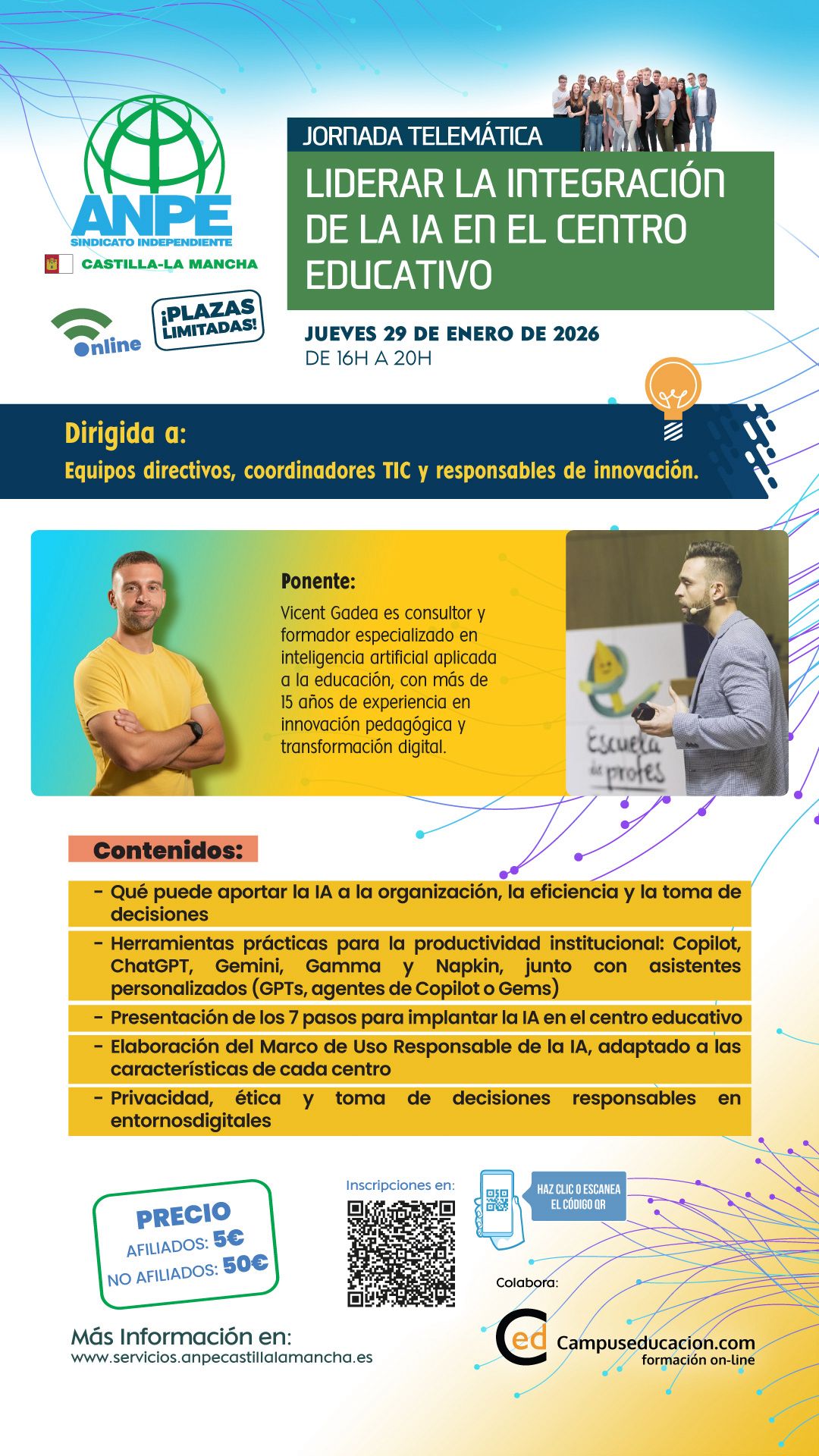 Tras el éxito de la jornada “Cómo integrar la IA en el aula”, organizada hace unos meses por ANPE CLM y dirigida por el formador especializado en inteligencia artificial aplicada a la educación Vicent Gadea, ANPE presenta ahora una nueva propuesta formativa: “Liderar la integración de la IA en el centro educativo”.