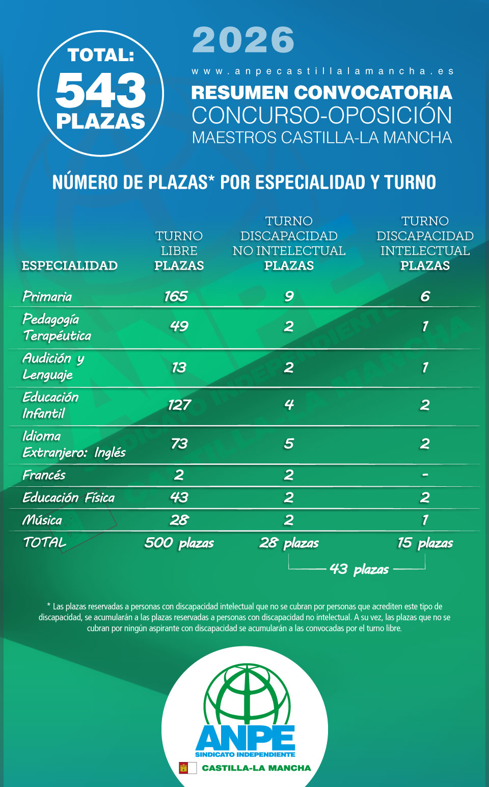 A continuación, se detalla la suma de las ofertas de empleo público de Maestros de 2024 y 2025, con la oferta de plazas a convocar en las oposiciones de 2026, que se celebrarán en el mes de junio: